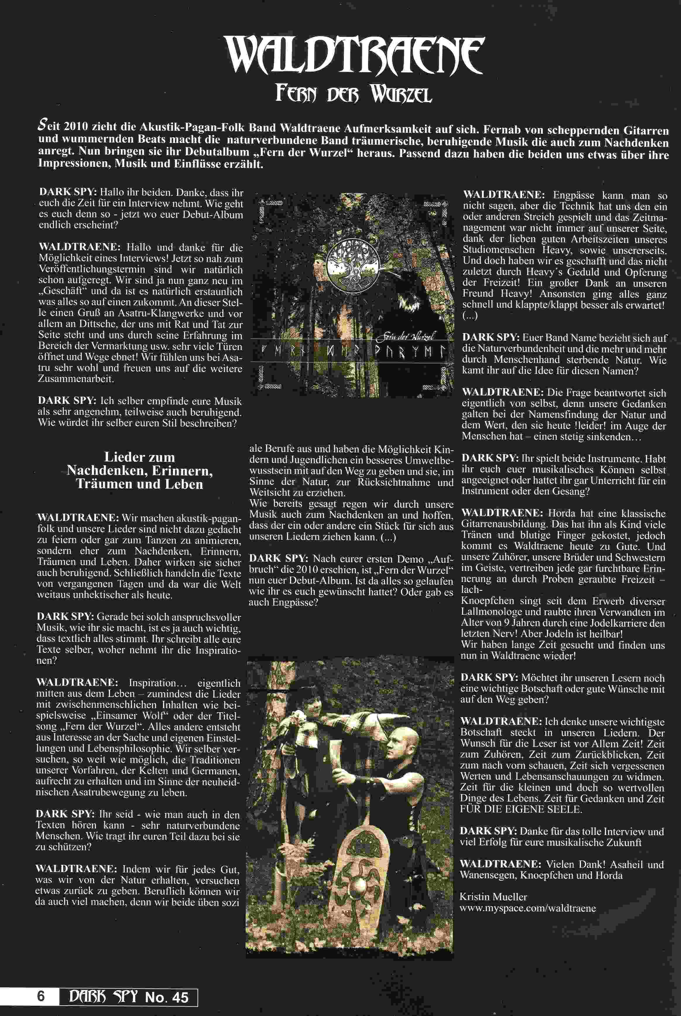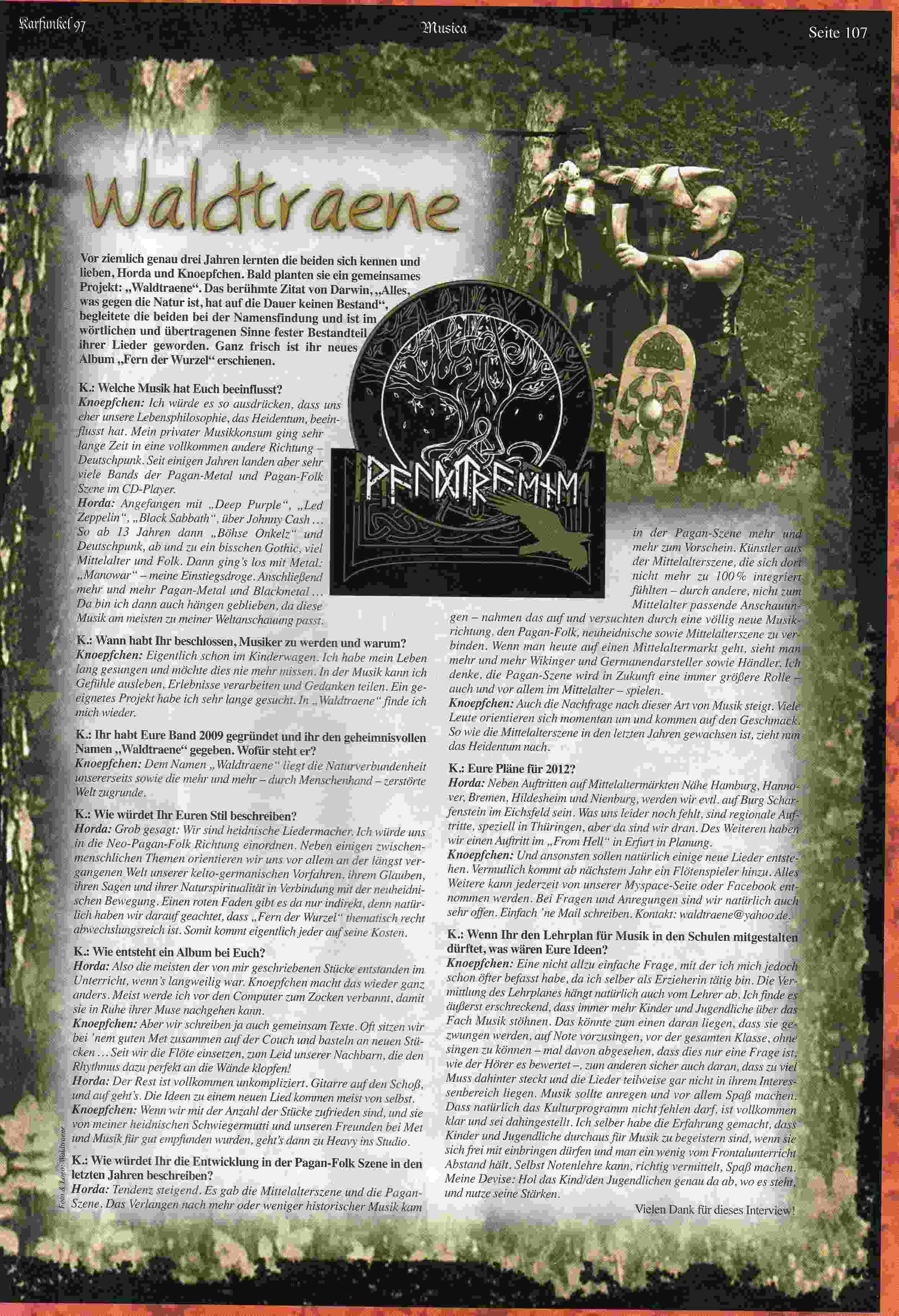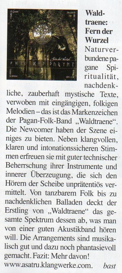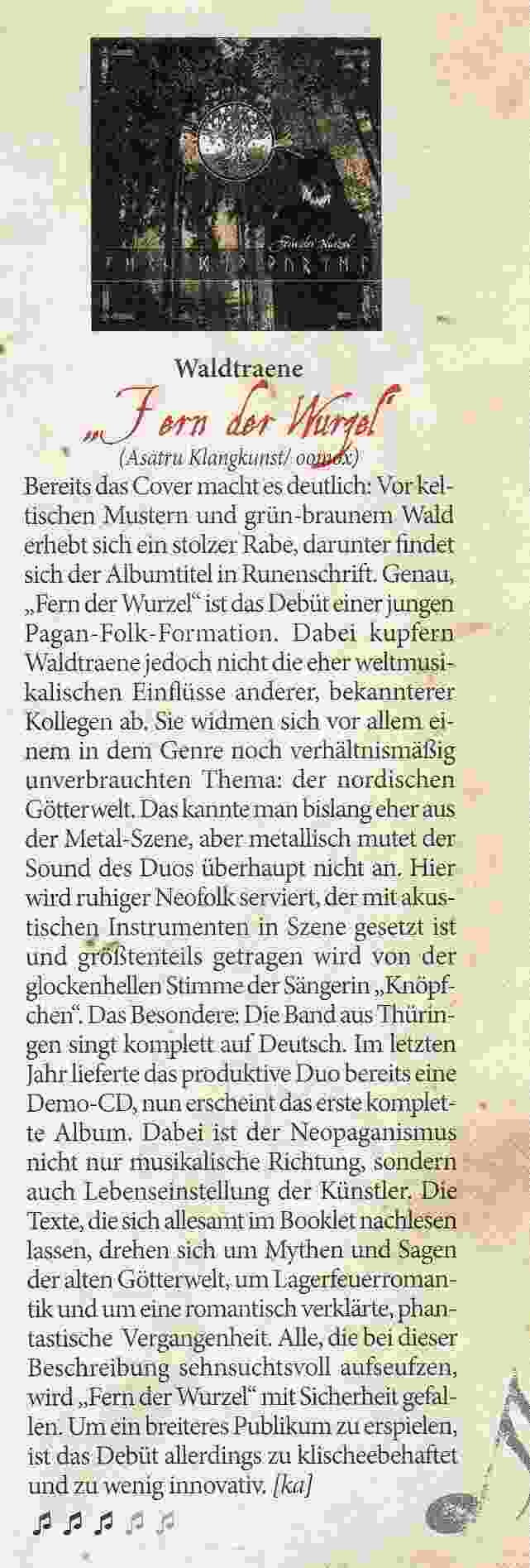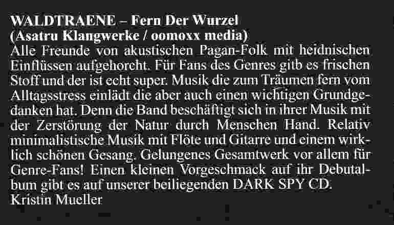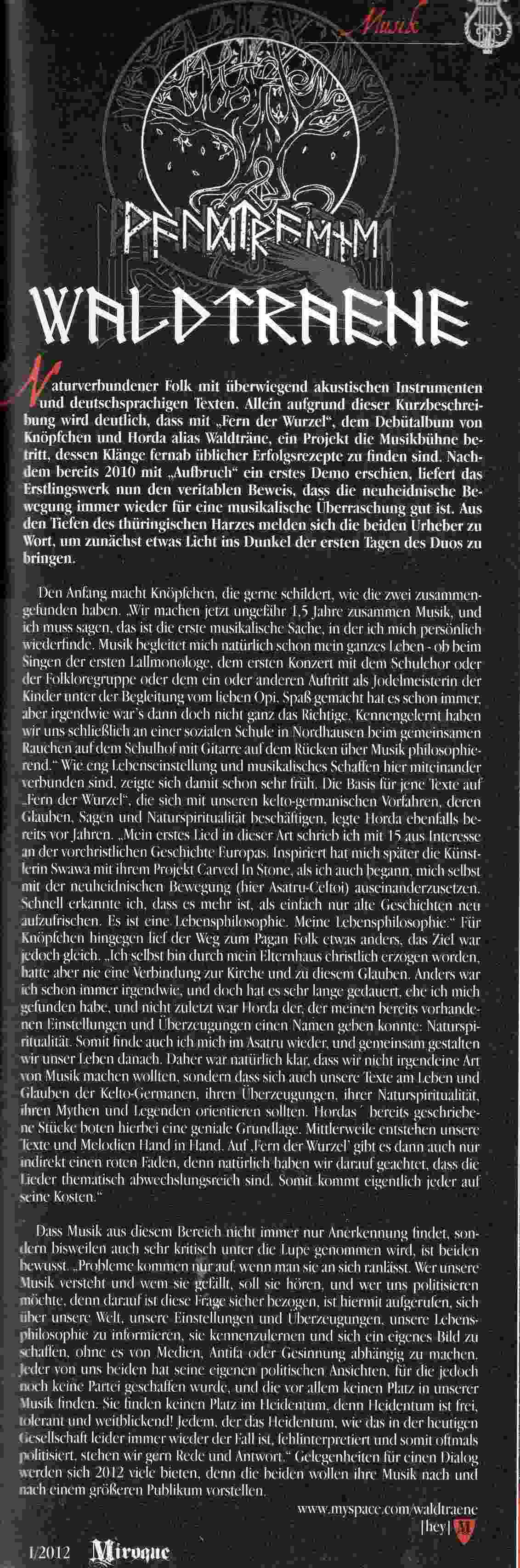 WALDTRAENE ist ein 2-Personenprojekt aus dem Harz in Thüringen, dessen Umegebung die band vermutlich zu ihrem Projekt inspiriert hat. Akustik Pagan Folk ist die Bezeichnung zu der folkigen, naturverbundenen Musik von Horda (Gesang, Gitarre, Didgeridoo) und Knoepfchen (Gesang, Flöte). Nach einem Demo ist “Fern der Wurzel” das erste Album, auf dem 11 Titel zu finden sind, die sich thematisch mit der vergangenen Welt der kelto-germanischen Vorfahren beschäftigt. Neben 9 Eigenproduktionen vertonten WALDTRAENE auch ein Gedicht von Felix Dahn.